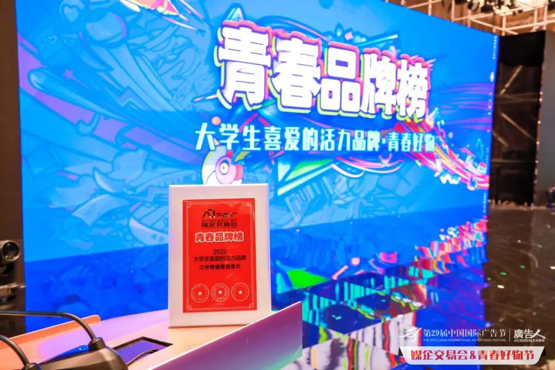 12月22日,在厦门国际会展中心举办的2022中国大学生广告艺术节学院奖秋季征集活动青春盛典上,江中牌健胃消食片荣获“2022大学生喜爱的活力品牌”桂冠称号,彰显了江中作为年轻人高度认可的国民品牌的活力与风采。